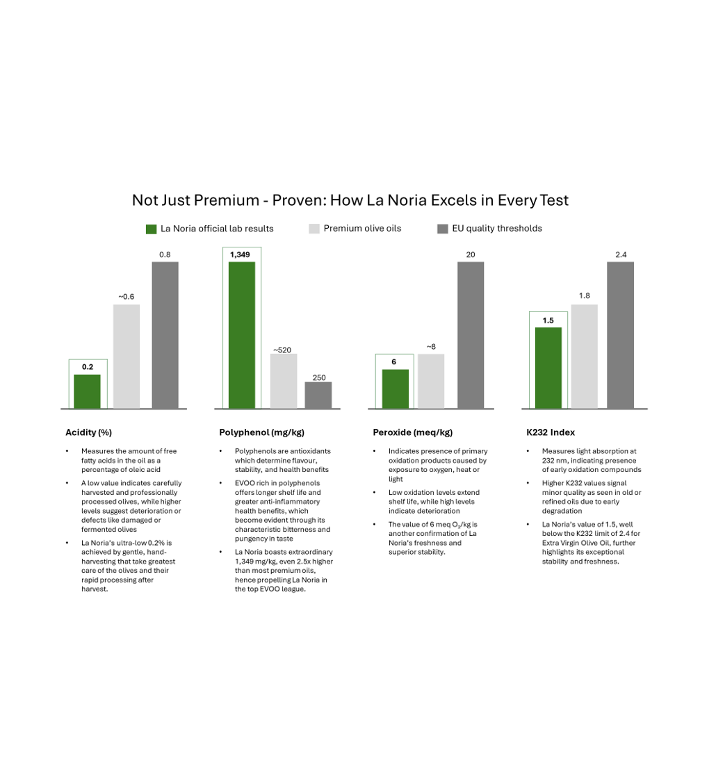 Certified by official lab tests and feedbacked by Michelin chefs and EVOO connoisseurs, La Noria is 'the perfect all arounder':